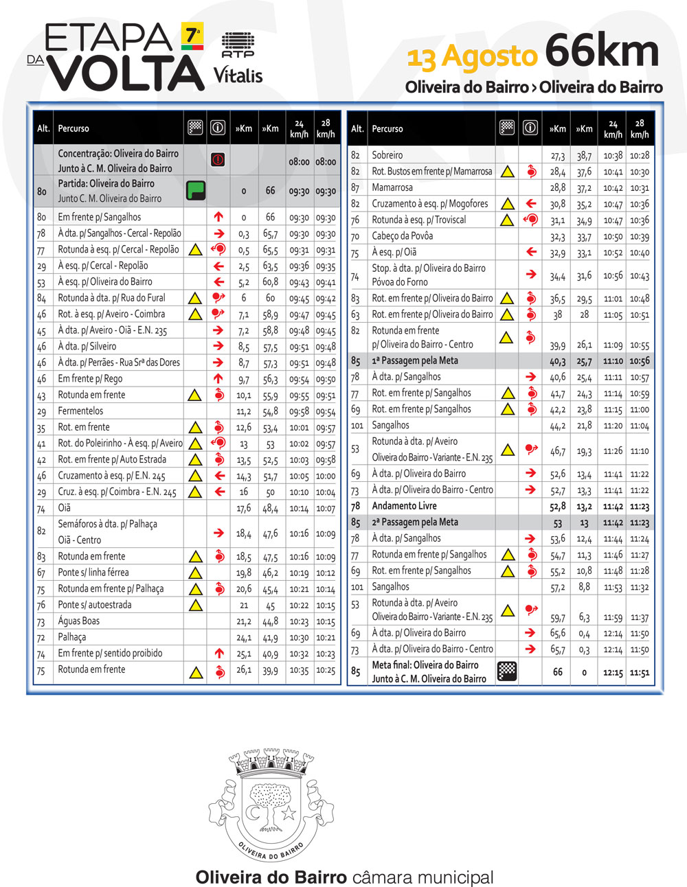 Estima-se que a média de velocidade para a 'Etapa da Volta' esteja compreendida entre os 24 e os 28 kms/h - tendo o percurso a extensão aproximada de 66 quilómetros. A concentração para a partida será em Oliveira do Bairro, junto à Câmara Municipal, a partir das 08h00, com partida real às 09h30, estando prevista a chegada, cerca das 12h15 horas, à Rua Conde Ferreira (Oliveira do Bairro). O local de banhos para todos os participantes da 'Etapa da Volta' será no Pavilhão Municipal de Oliveira do Bairro.